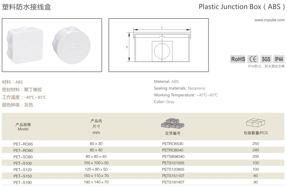 尺寸:80×40(mm)多重密封/安全防水 防水IP等級 (IP44)可供選材料(常ABS)ABS阻燃、PC,合金材PC阻燃安全可靠/耐高溫/耐電/壽命長每一個部分都是精心挑選的,只是為了打造一個好的產(chǎn)品