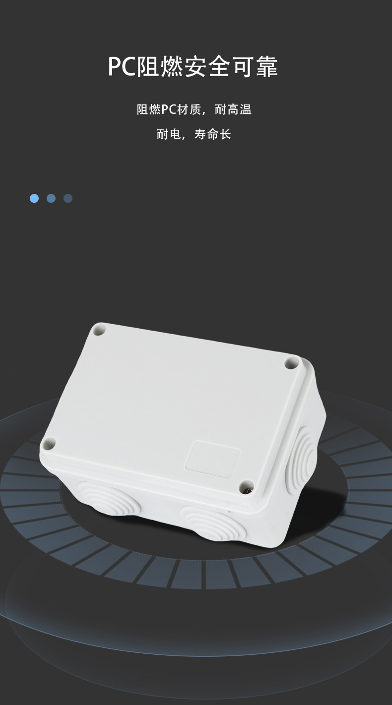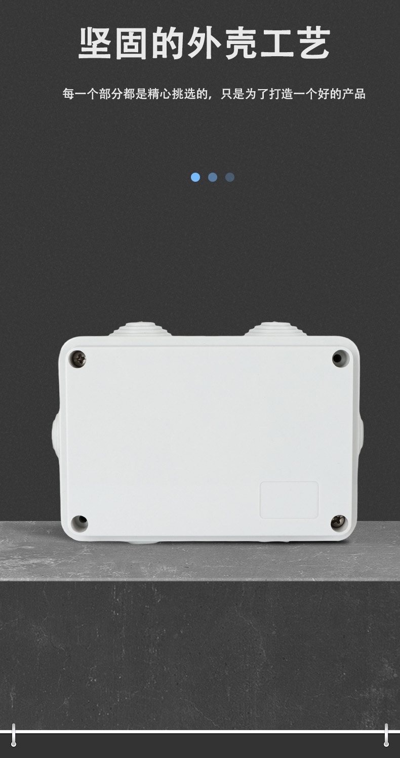 尺寸:120×80×50(mm)多重密封/安全防水 防水IP等級(jí) (IP44)可供選材料(常ABS)ABS阻燃、PC,合金材PC阻燃安全可靠/耐高溫/耐電/壽命長每一個(gè)部分都是精心挑選的,只是為了打造一個(gè)好的產(chǎn)品