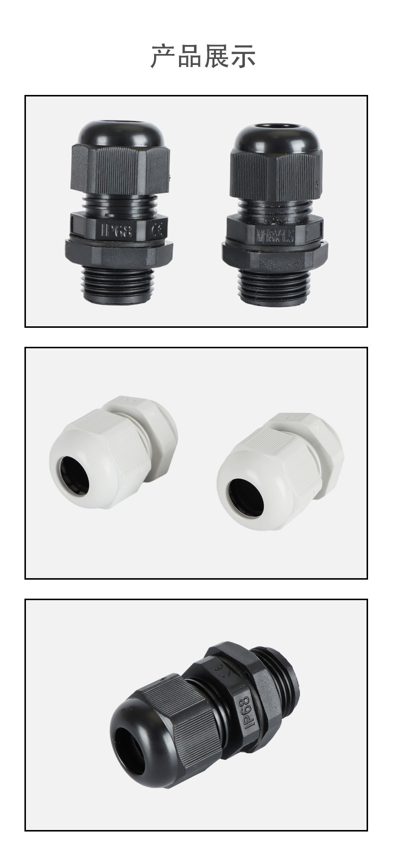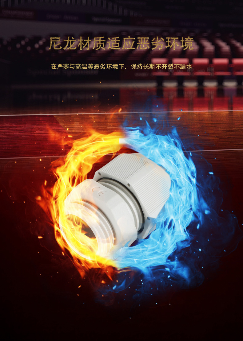 尼龍材質(zhì)適用惡劣環(huán)境紅、灰、黑、深灰、白、藍(lán) 六種顏色常規(guī):黑、灰兩種顏色,其它顏色需要定做在嚴(yán)寒與高溫等惡劣環(huán)境下,保持長(zhǎng)期不開(kāi)裂不漏水高密封性防水接頭保護(hù)電纜安全,長(zhǎng)期使用不容易滲水