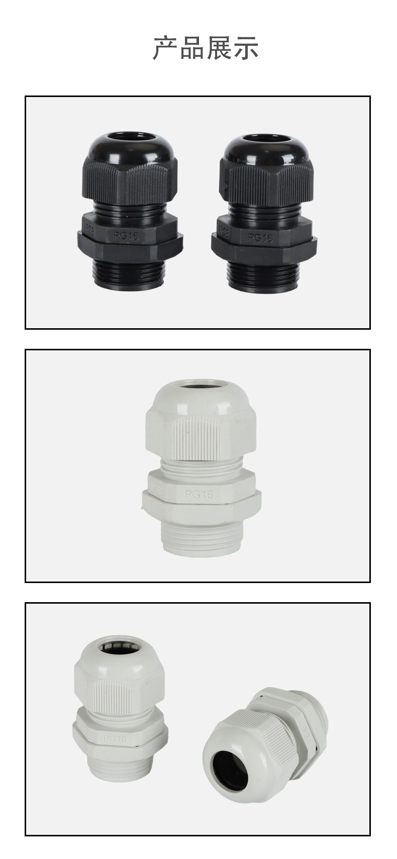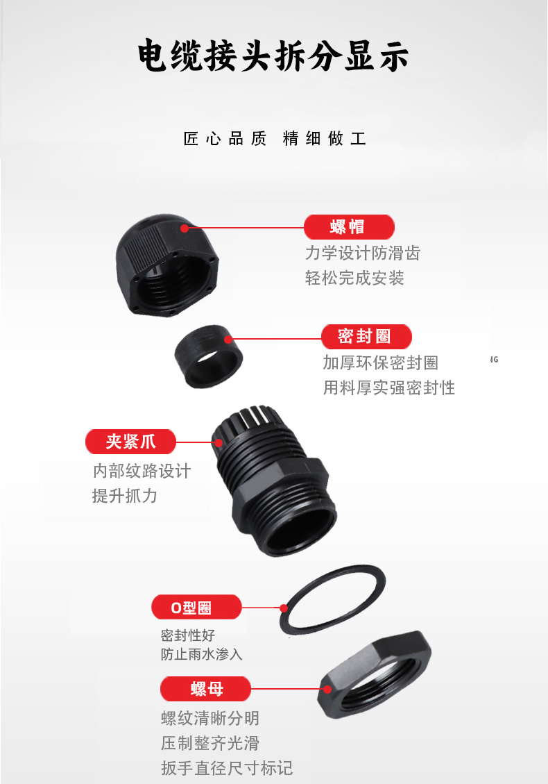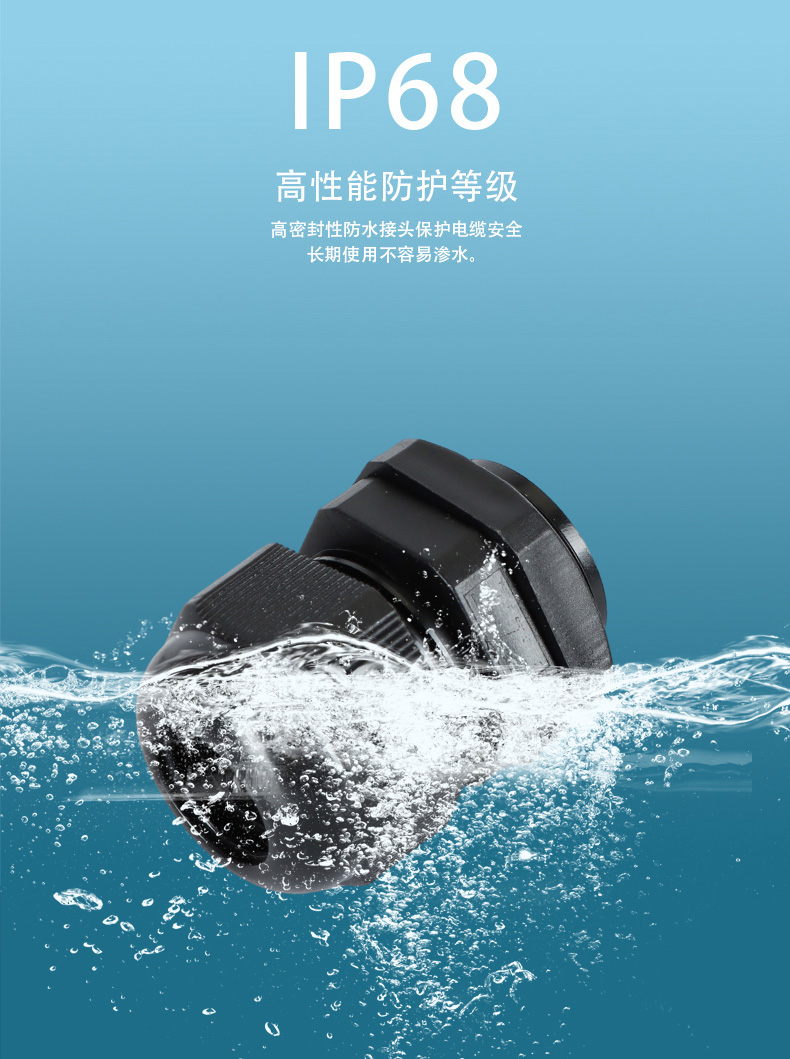 尼龍材質適用惡劣環(huán)境紅、灰、黑、深灰、白、藍 六種顏色常規(guī):黑、灰兩種顏色,其它顏色需要定做在嚴寒與高溫等惡劣環(huán)境下,保持長期不開裂不漏水高密封性防水接頭保護電纜安全,長期使用不容易滲水