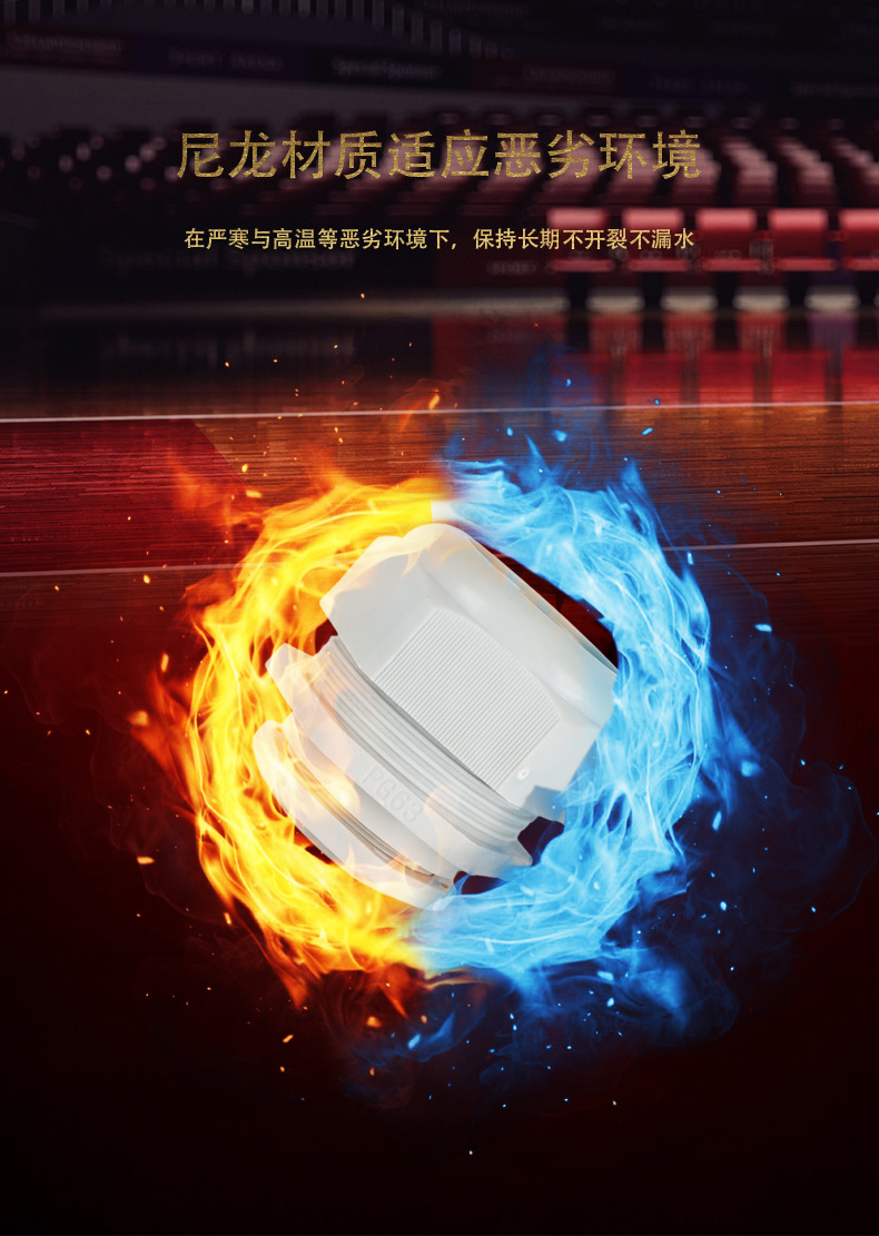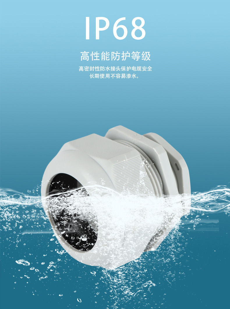 尼龍材質(zhì)適用惡劣環(huán)境紅、灰、黑、深灰、白、藍(lán) 六種顏色常規(guī):黑、灰兩種顏色,其它顏色需要定做在嚴(yán)寒與高溫等惡劣環(huán)境下,保持長期不開裂不漏水高密封性防水接頭保護(hù)電纜安全,長期使用不容易滲水