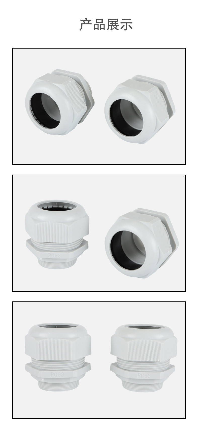 尼龍材質(zhì)適用惡劣環(huán)境紅、灰、黑、深灰、白、藍(lán) 六種顏色常規(guī):黑、灰兩種顏色,其它顏色需要定做在嚴(yán)寒與高溫等惡劣環(huán)境下,保持長(zhǎng)期不開裂不漏水高密封性防水接頭保護(hù)電纜安全,長(zhǎng)期使用不容易滲水