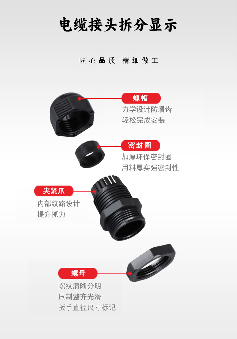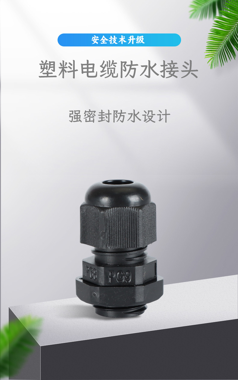 尼龍材質(zhì)適用惡劣環(huán)境紅、灰、黑、深灰、白、藍(lán) 六種顏色常規(guī):黑、灰兩種顏色,其它顏色需要定做在嚴(yán)寒與高溫等惡劣環(huán)境下,保持長期不開裂不漏水高密封性防水接頭保護(hù)電纜安全,長期使用不容易滲水