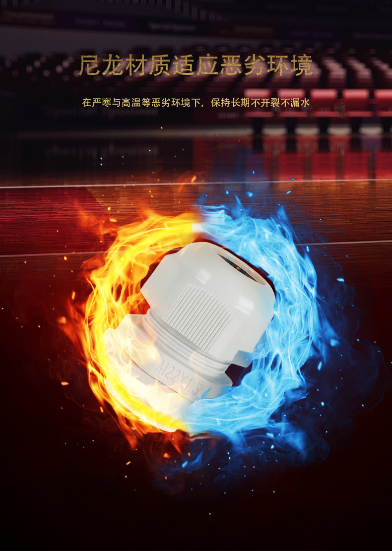 尼龍材質(zhì)適用惡劣環(huán)境紅、灰、黑、深灰、白、藍 六種顏色常規(guī):黑、灰兩種顏色,其它顏色需要定做在嚴(yán)寒與高溫等惡劣環(huán)境下,保持長期不開裂不漏水高密封性防水接頭保護電纜安全,長期使用不容易滲水