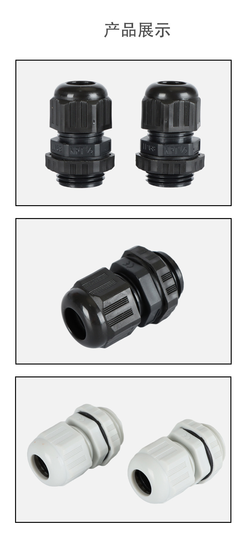 強(qiáng)密封防水設(shè)計(jì)紅、灰、黑、深灰、白、藍(lán) 六種顏色常規(guī):黑、灰兩種顏色,其它顏色需要定做在嚴(yán)寒與高溫等惡劣環(huán)境下,保持長期不開裂不漏水高密封性防水接頭保護(hù)電纜安全,長期使用不容易滲水