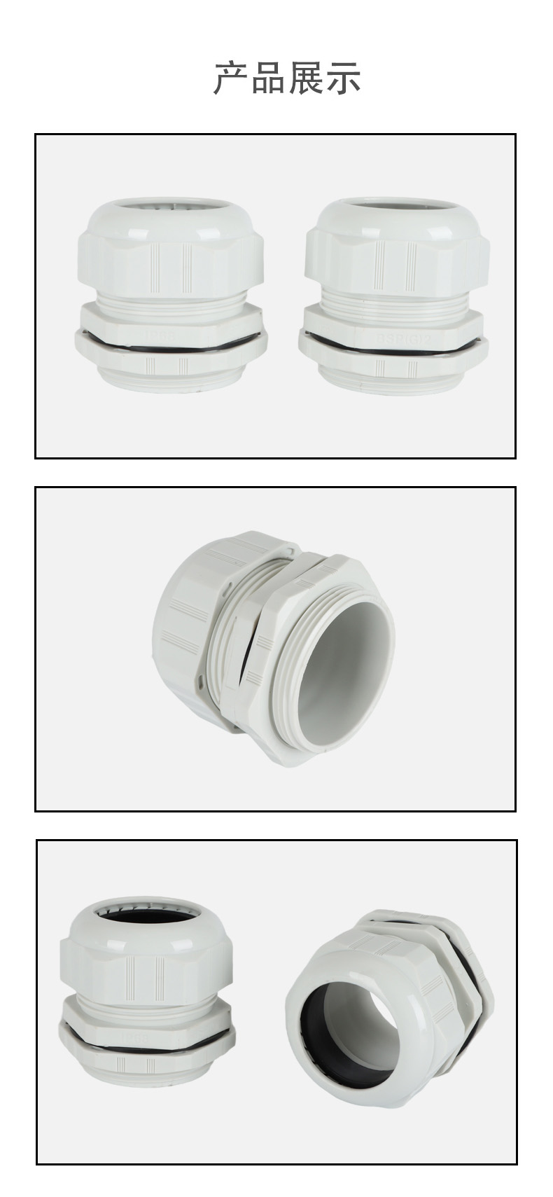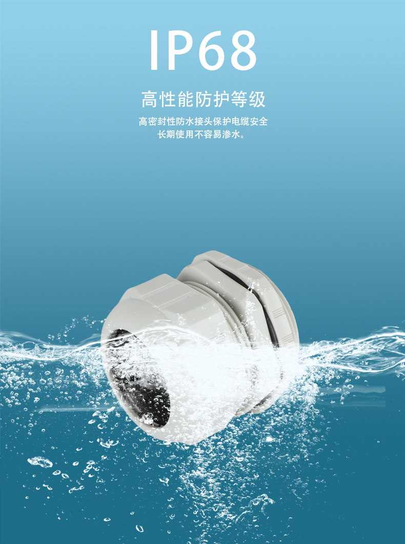 尼龍材質(zhì)適用惡劣環(huán)境紅、灰、黑、深灰、白、藍 六種顏色常規(guī):黑、灰兩種顏色,其它顏色需要定做在嚴寒與高溫等惡劣環(huán)境下,保持長期不開裂不漏水高密封性防水接頭保護電纜安全,長期使用不容易滲水