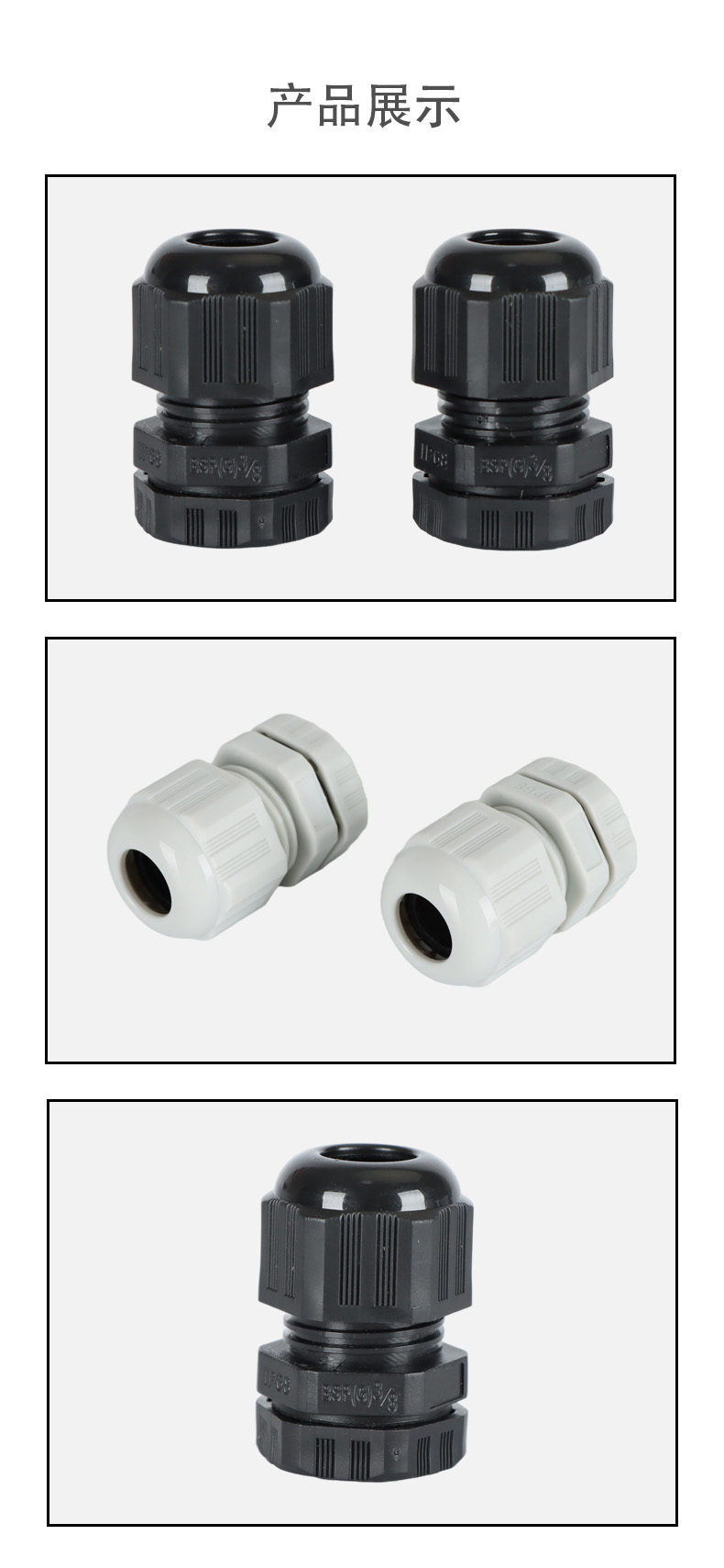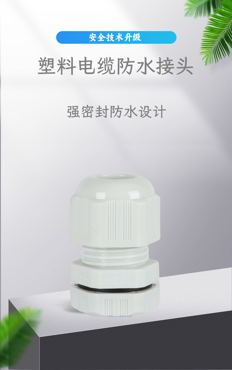 尼龍材質(zhì)適用惡劣環(huán)境紅、灰、黑、深灰、白、藍(lán) 六種顏色常規(guī):黑、灰兩種顏色,其它顏色需要定做在嚴(yán)寒與高溫等惡劣環(huán)境下,保持長(zhǎng)期不開裂不漏水高密封性防水接頭保護(hù)電纜安全,長(zhǎng)期使用不容易滲水