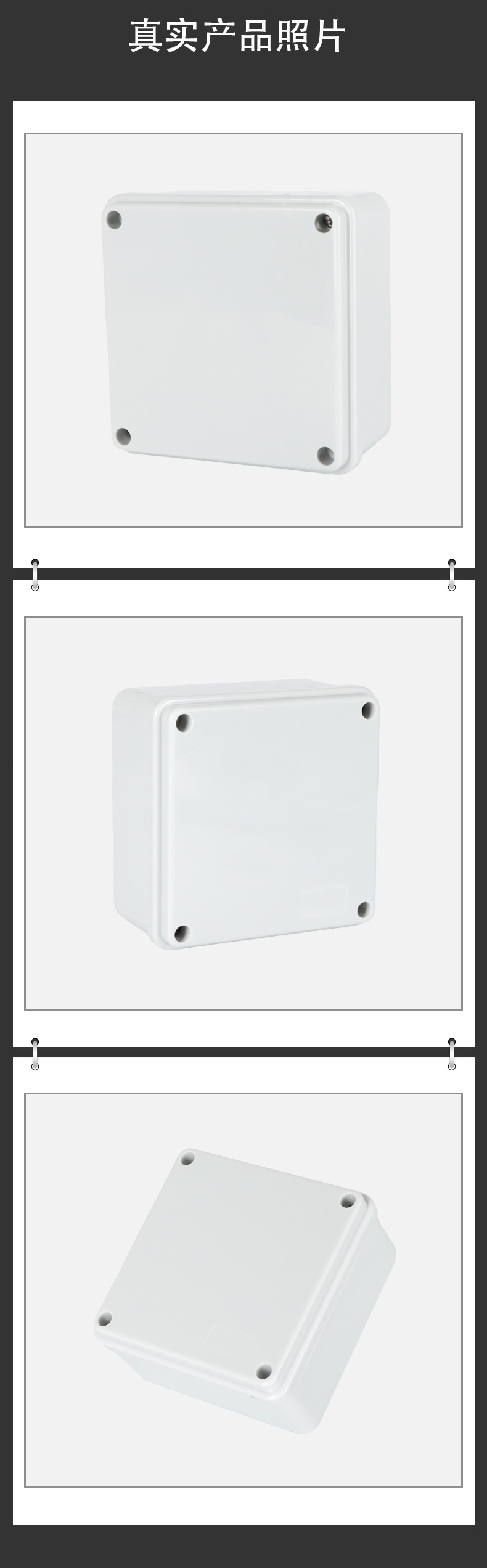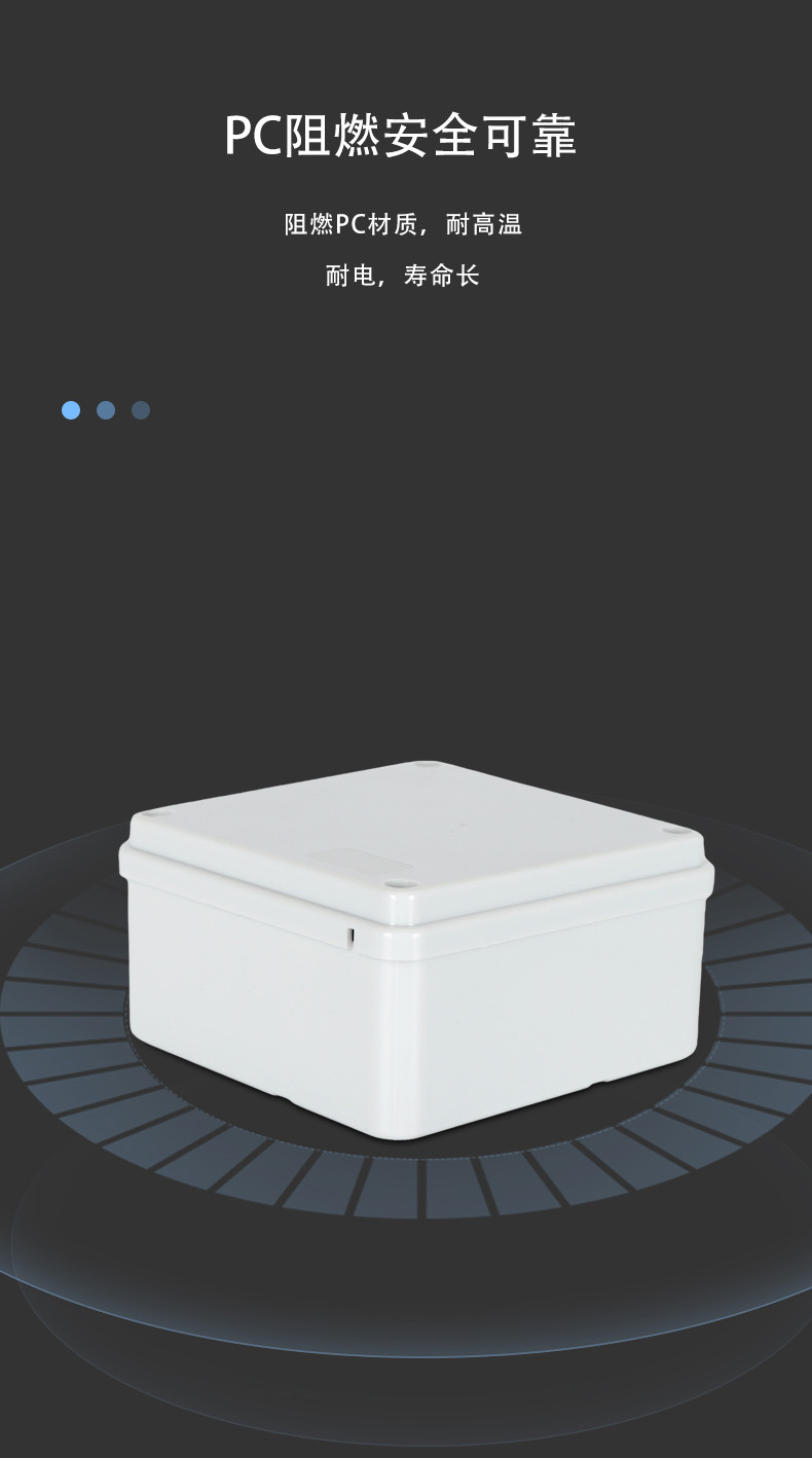 尺寸:100×100×50(mm)多重密封/安全防水 防水IP等級(jí) (IP44)可供選材料(常ABS)ABS阻燃、PC,合金材PC阻燃安全可靠/耐高溫/耐電/壽命長(zhǎng)每一個(gè)部分都是精心挑選的,只是為了打造一個(gè)好的產(chǎn)品