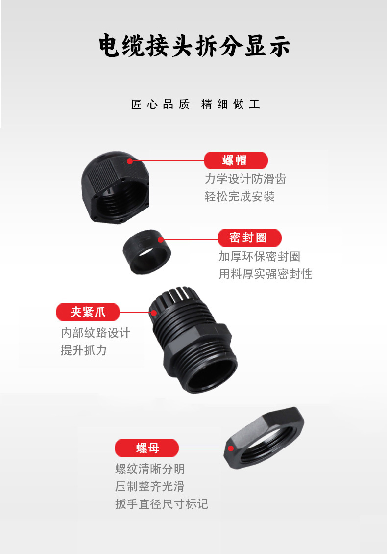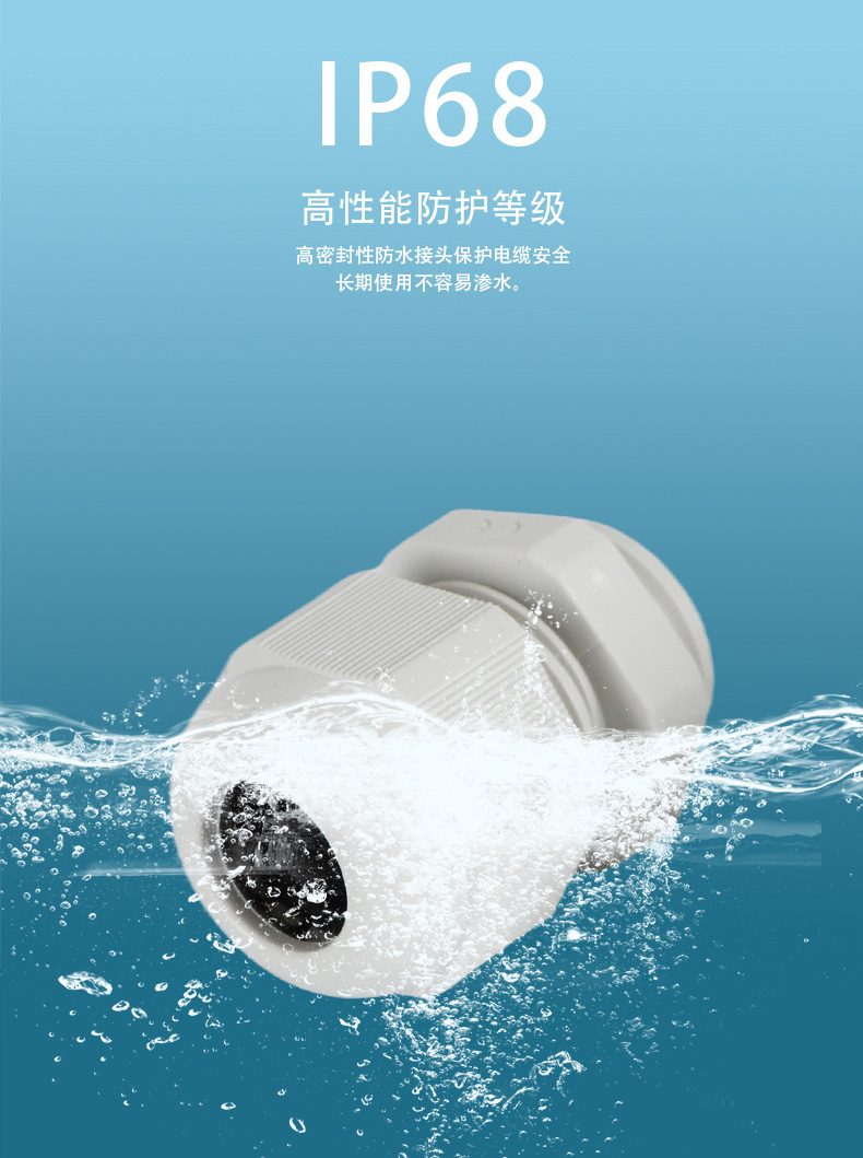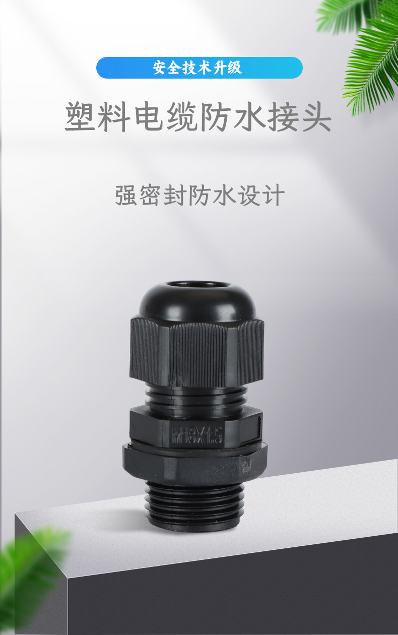 尼龍材質(zhì)適用惡劣環(huán)境紅、灰、黑、深灰、白、藍(lán) 六種顏色常規(guī):黑、灰兩種顏色,其它顏色需要定做在嚴(yán)寒與高溫等惡劣環(huán)境下,保持長(zhǎng)期不開(kāi)裂不漏水高密封性防水接頭保護(hù)電纜安全,長(zhǎng)期使用不容易滲水