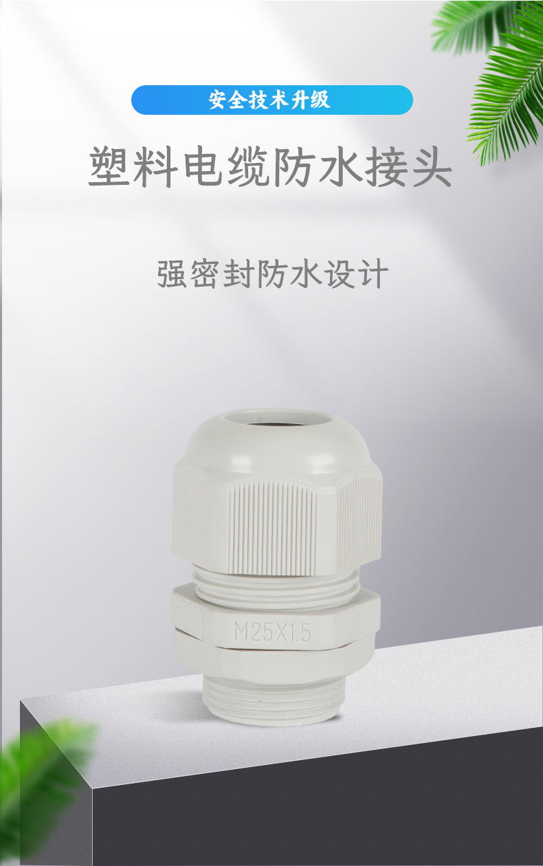 尼龍材質(zhì)適用惡劣環(huán)境紅、灰、黑、深灰、白、藍(lán) 六種顏色常規(guī):黑、灰兩種顏色,其它顏色需要定做在嚴(yán)寒與高溫等惡劣環(huán)境下,保持長期不開裂不漏水高密封性防水接頭保護(hù)電纜安全,長期使用不容易滲水