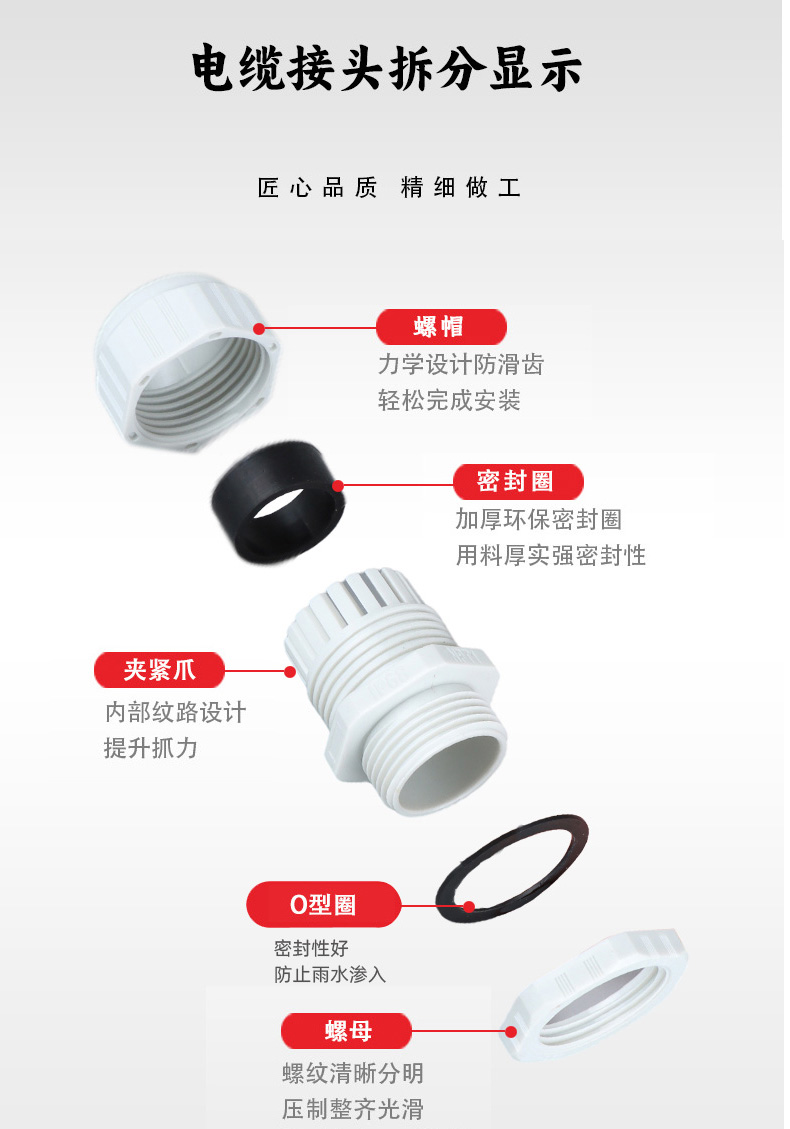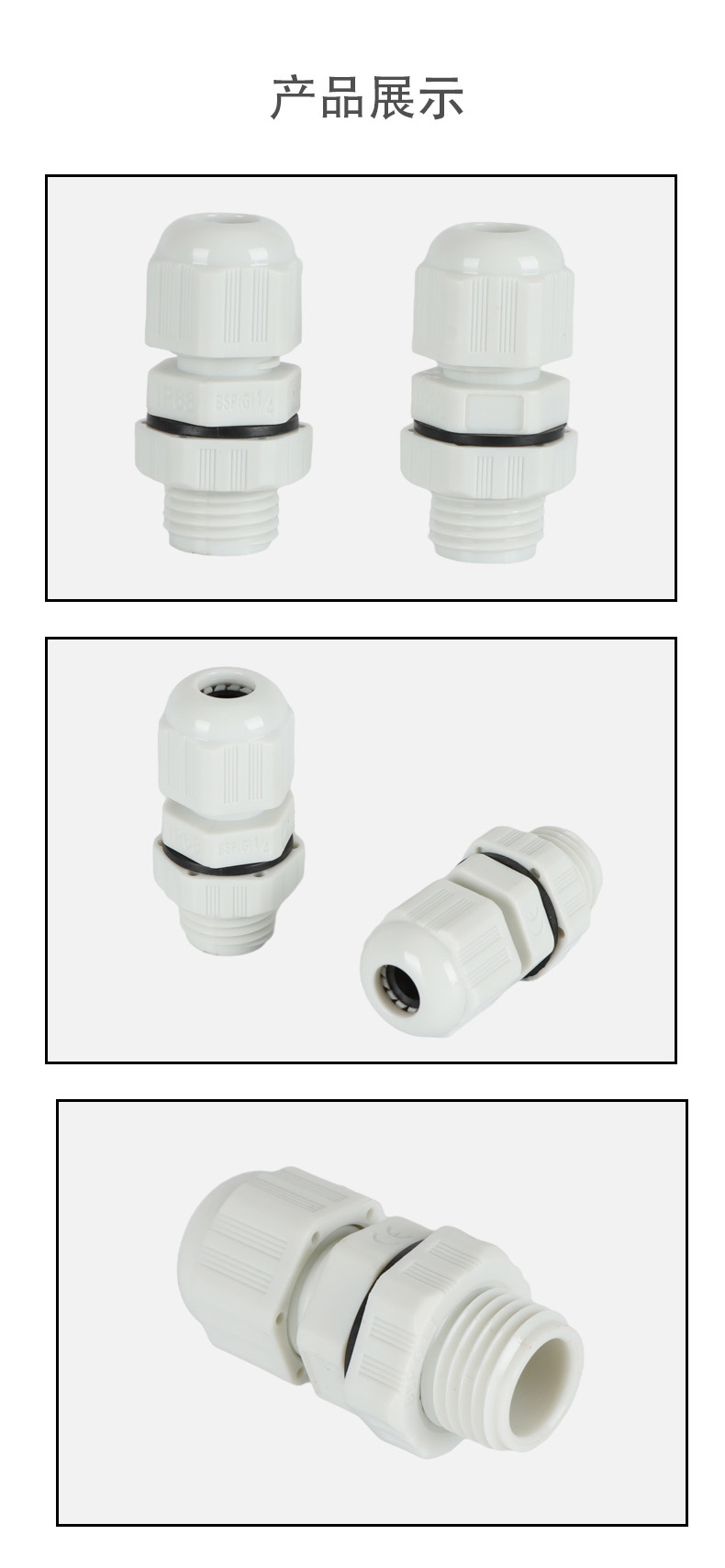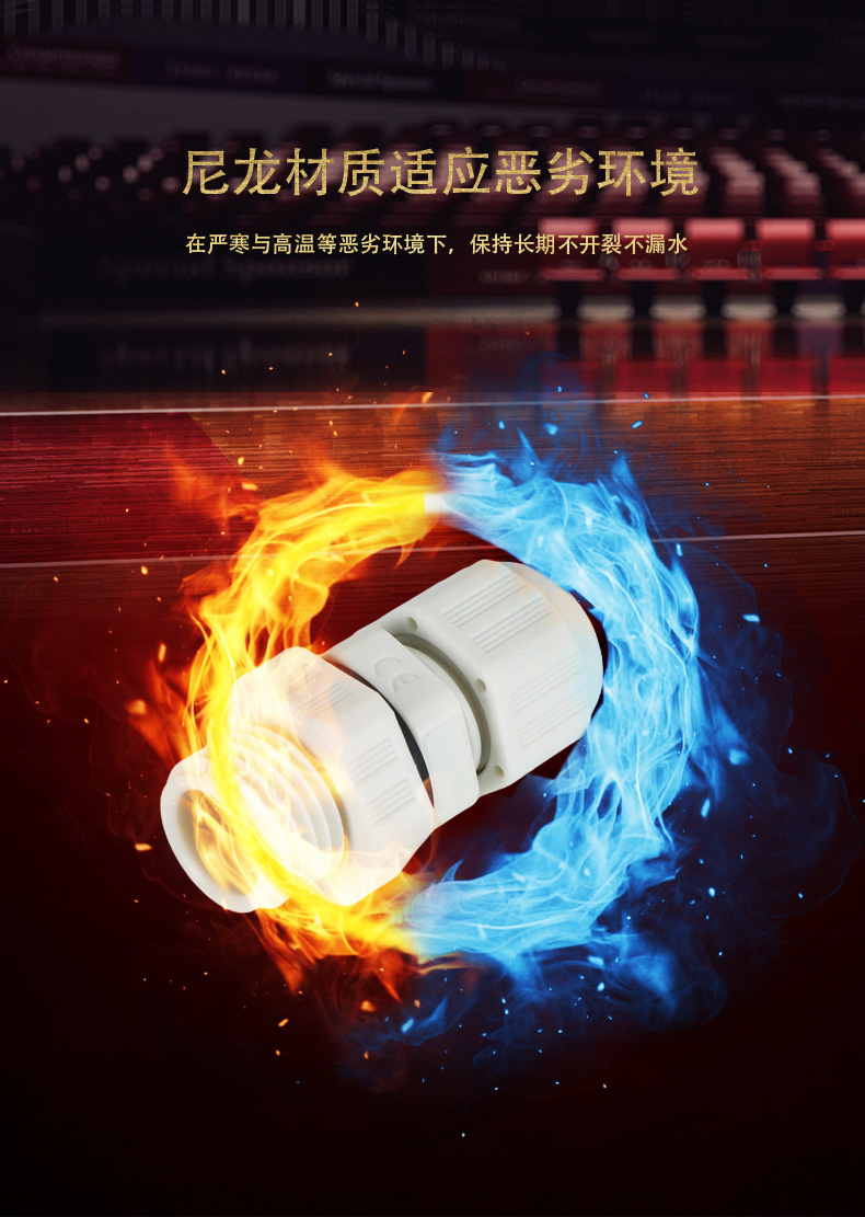 尼龍材質(zhì)適用惡劣環(huán)境紅、灰、黑、深灰、白、藍(lán) 六種顏色常規(guī):黑、灰兩種顏色,其它顏色需要定做在嚴(yán)寒與高溫等惡劣環(huán)境下,保持長期不開裂不漏水高密封性防水接頭保護(hù)電纜安全,長期使用不容易滲水
