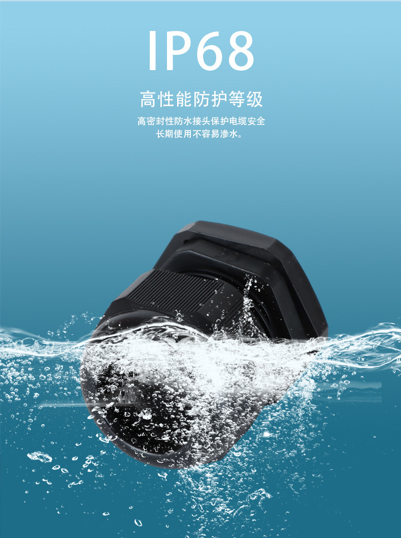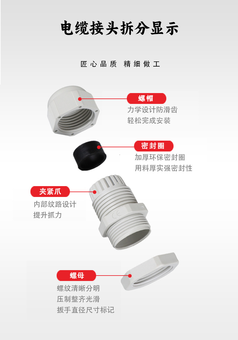 尼龍材質適用惡劣環(huán)境紅、灰、黑、深灰、白、藍 六種顏色常規(guī):黑、灰兩種顏色,其它顏色需要定做在嚴寒與高溫等惡劣環(huán)境下,保持長期不開裂不漏水高密封性防水接頭保護電纜安全,長期使用不容易滲水