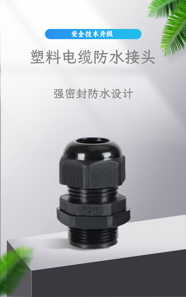 尼龍材質適用惡劣環(huán)境紅、灰、黑、深灰、白、藍 六種顏色常規(guī):黑、灰兩種顏色,其它顏色需要定做在嚴寒與高溫等惡劣環(huán)境下,保持長期不開裂不漏水高密封性防水接頭保護電纜安全,長期使用不容易滲水