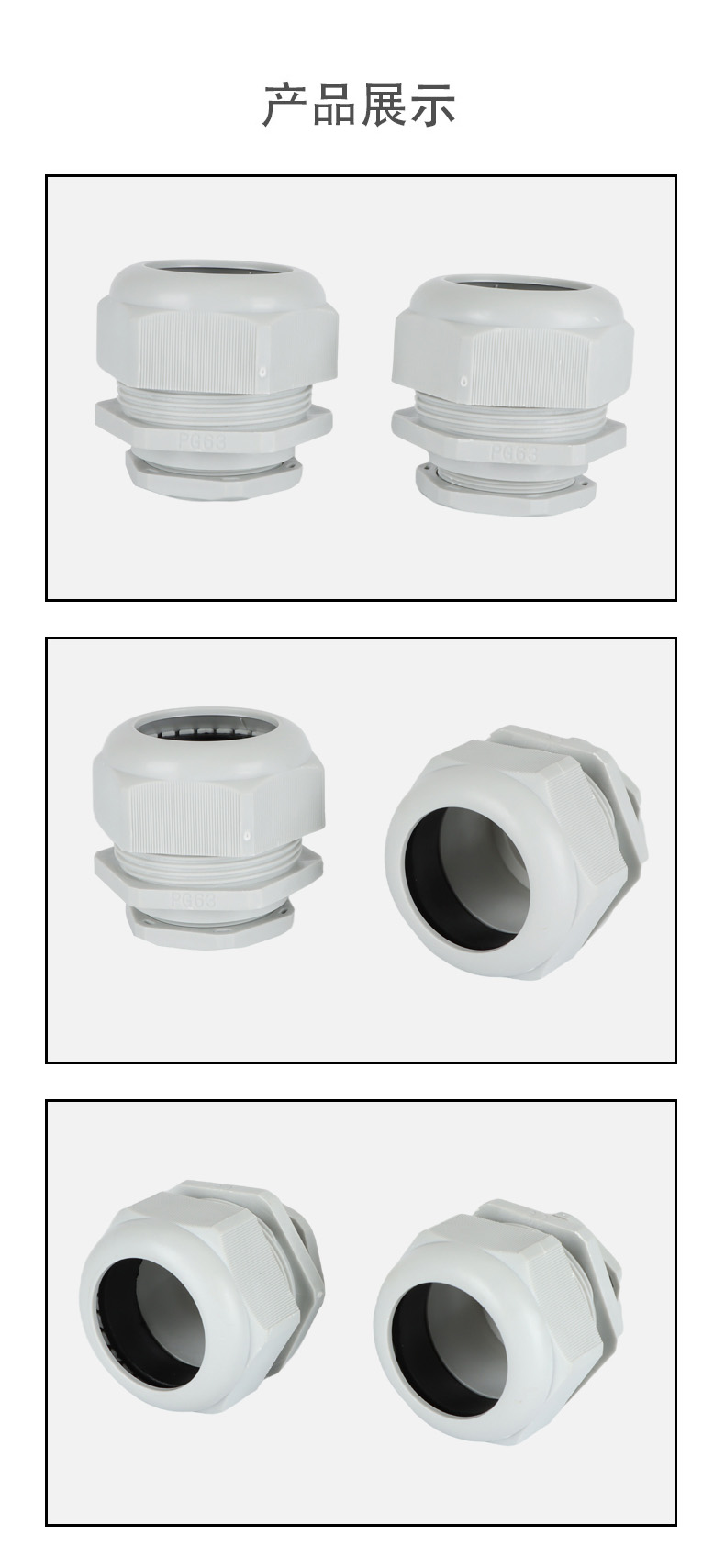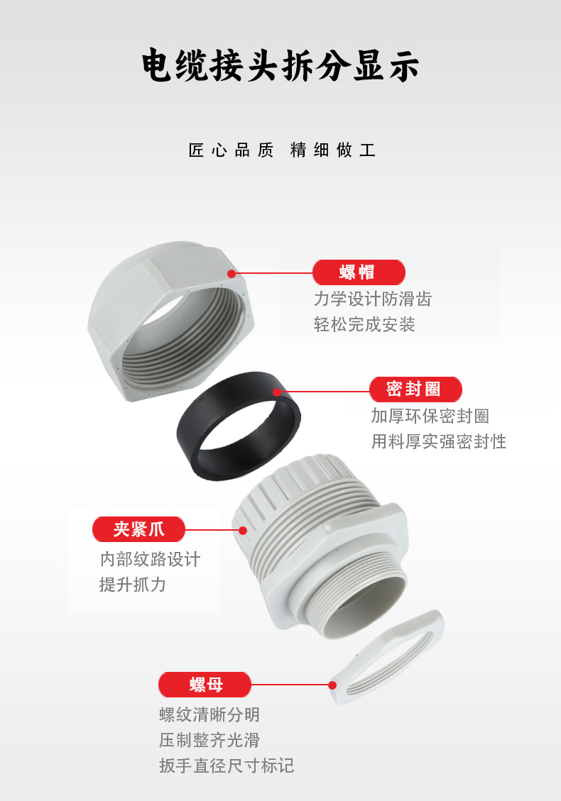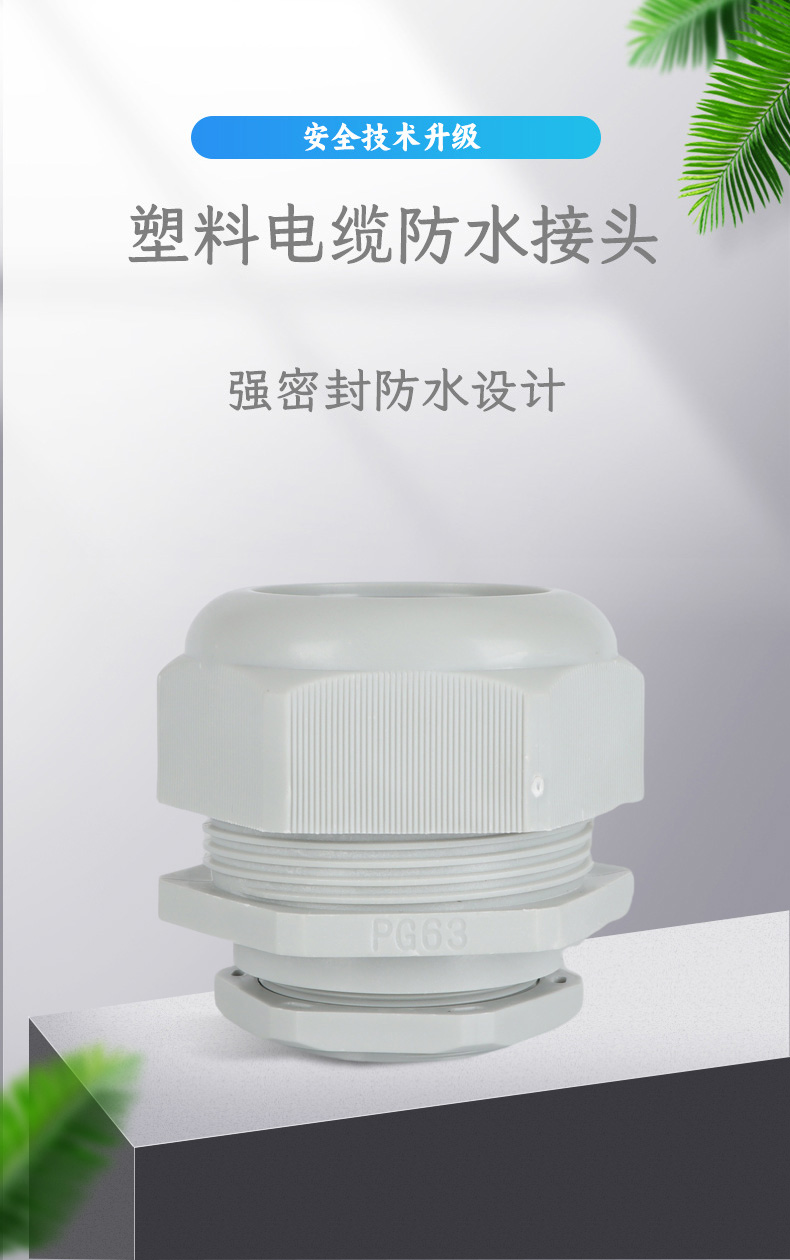 尼龍材質(zhì)適用惡劣環(huán)境紅、灰、黑、深灰、白、藍(lán) 六種顏色常規(guī):黑、灰兩種顏色,其它顏色需要定做在嚴(yán)寒與高溫等惡劣環(huán)境下,保持長期不開裂不漏水高密封性防水接頭保護(hù)電纜安全,長期使用不容易滲水
