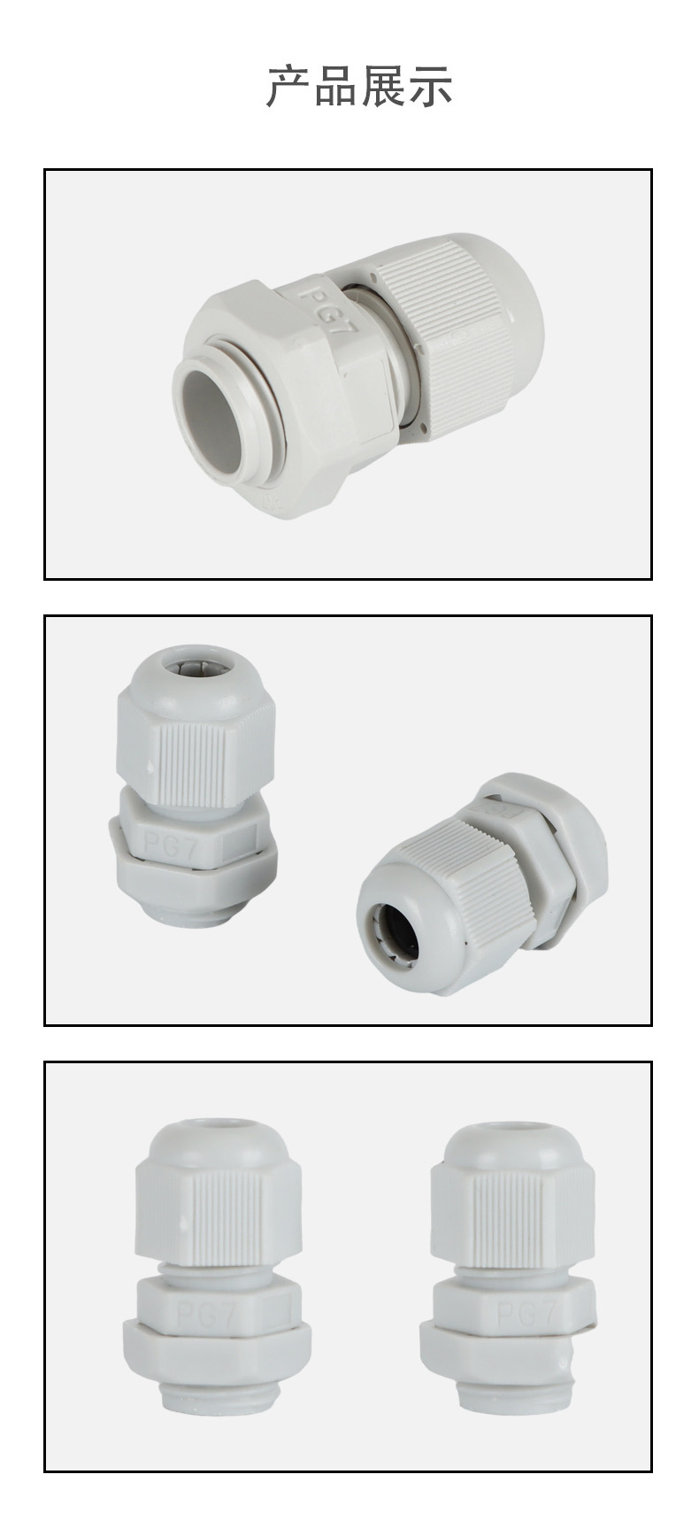 尼龍材質(zhì)適用惡劣環(huán)境紅、灰、黑、深灰、白、藍(lán) 六種顏色常規(guī):黑、灰兩種顏色,其它顏色需要定做在嚴(yán)寒與高溫等惡劣環(huán)境下,保持長(zhǎng)期不開(kāi)裂不漏水高密封性防水接頭保護(hù)電纜安全,長(zhǎng)期使用不容易滲水