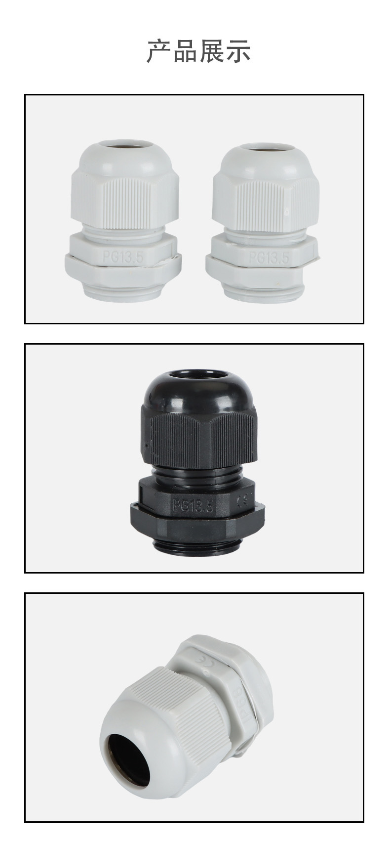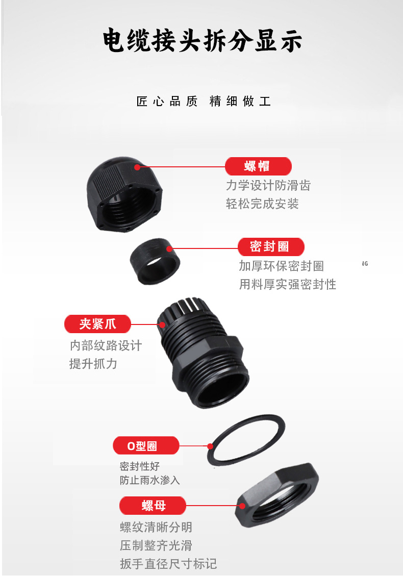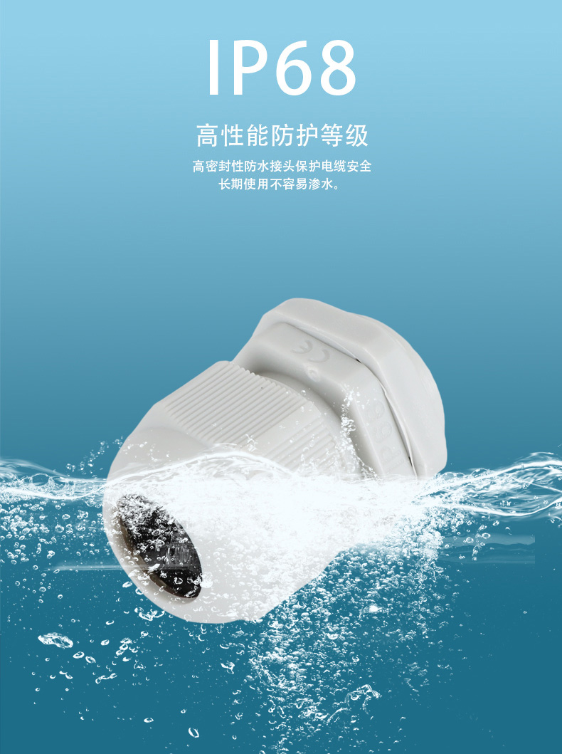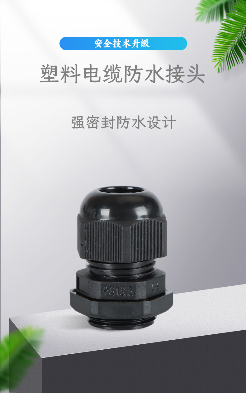 尼龍材質(zhì)適用惡劣環(huán)境紅、灰、黑、深灰、白、藍(lán) 六種顏色常規(guī):黑、灰兩種顏色,其它顏色需要定做在嚴(yán)寒與高溫等惡劣環(huán)境下,保持長(zhǎng)期不開(kāi)裂不漏水高密封性防水接頭保護(hù)電纜安全,長(zhǎng)期使用不容易滲水