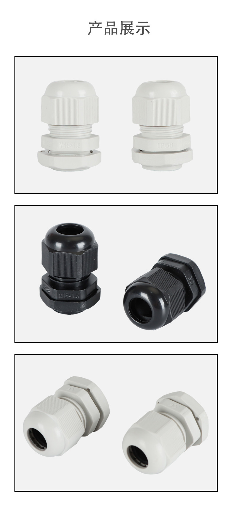 尼龍材質(zhì)適用惡劣環(huán)境紅、灰、黑、深灰、白、藍(lán) 六種顏色常規(guī):黑、灰兩種顏色,其它顏色需要定做在嚴(yán)寒與高溫等惡劣環(huán)境下,保持長期不開裂不漏水高密封性防水接頭保護(hù)電纜安全,長期使用不容易滲水