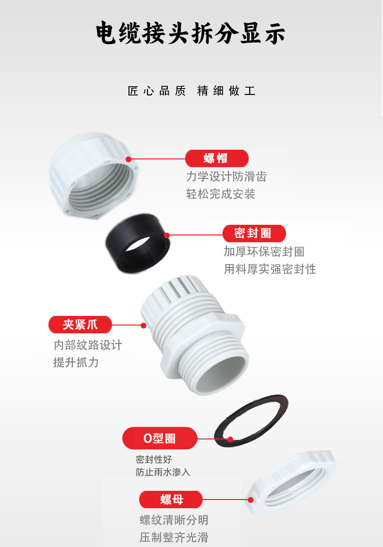 尼龍材質(zhì)適用惡劣環(huán)境紅、灰、黑、深灰、白、藍 六種顏色常規(guī):黑、灰兩種顏色,其它顏色需要定做在嚴寒與高溫等惡劣環(huán)境下,保持長期不開裂不漏水高密封性防水接頭保護電纜安全,長期使用不容易滲水