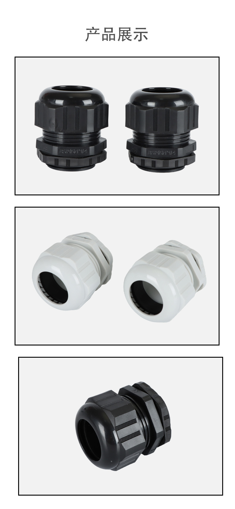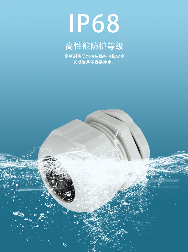 尼龍材質適用惡劣環(huán)境紅、灰、黑、深灰、白、藍 六種顏色常規(guī):黑、灰兩種顏色,其它顏色需要定做在嚴寒與高溫等惡劣環(huán)境下,保持長期不開裂不漏水高密封性防水接頭保護電纜安全,長期使用不容易滲水