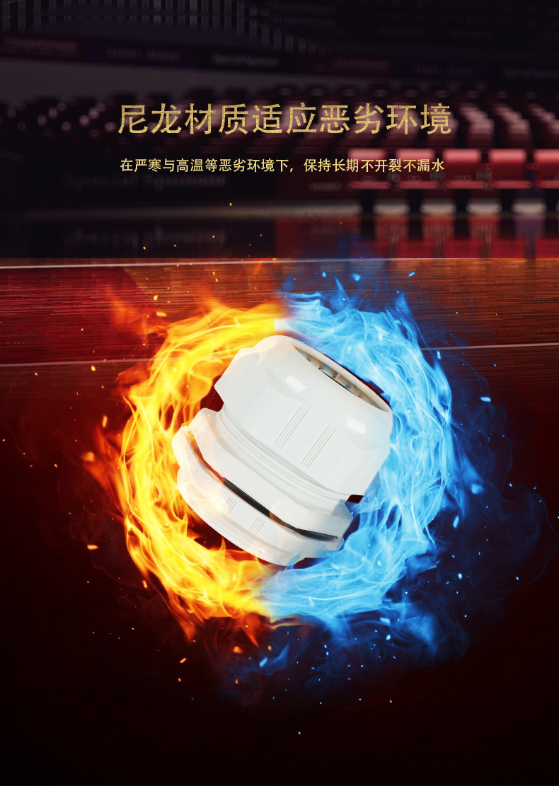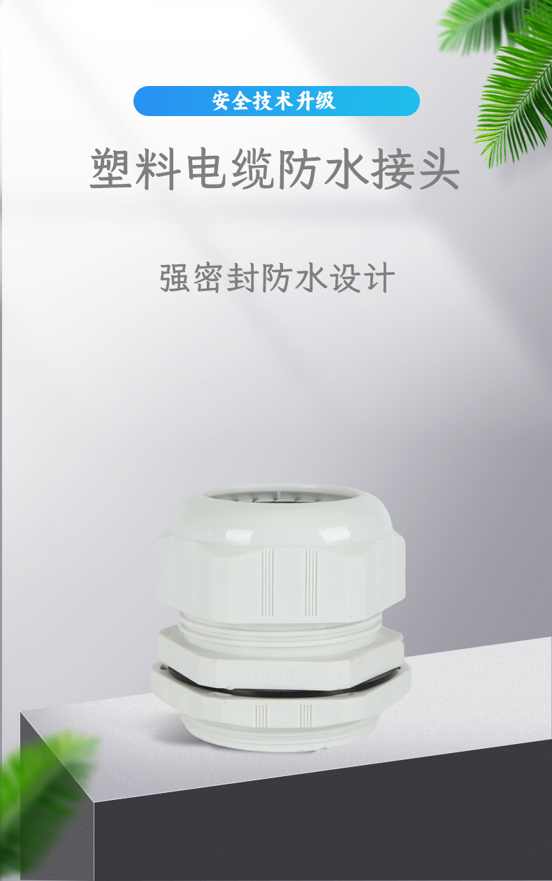 尼龍材質(zhì)適用惡劣環(huán)境紅、灰、黑、深灰、白、藍 六種顏色常規(guī):黑、灰兩種顏色,其它顏色需要定做在嚴寒與高溫等惡劣環(huán)境下,保持長期不開裂不漏水高密封性防水接頭保護電纜安全,長期使用不容易滲水